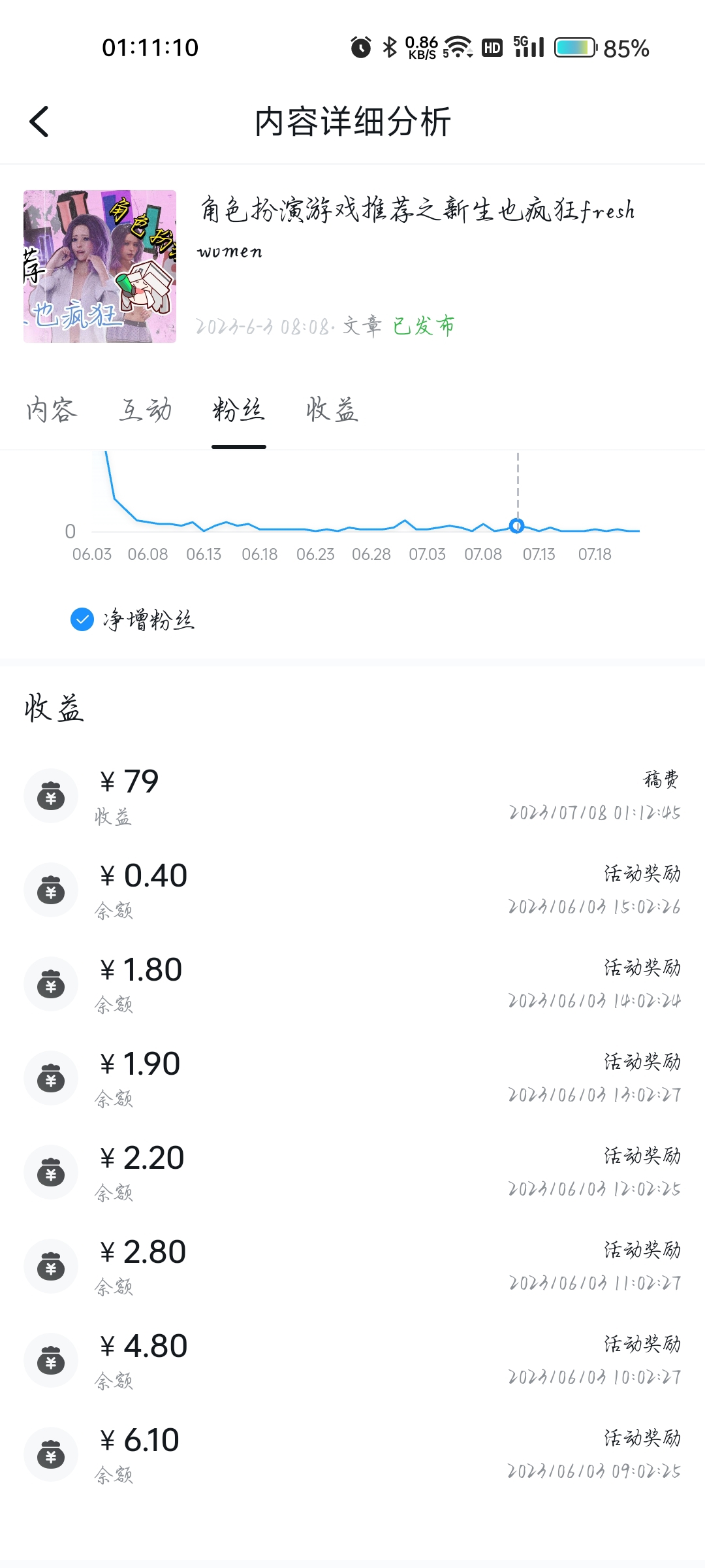 发一个帖子,获得的稿件收益由两部分组成,收益和余额,余额前面讲过了。收益就是可以提现的余额。会依据你的帖子的点赞充电等数据来结算。