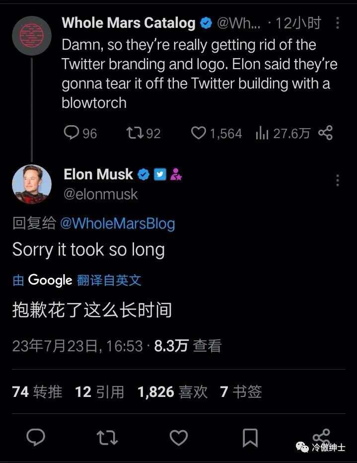然后,在接下来的几个小时里,马斯克对其他推文和回复做了暗示,在推特上发布了“Deus X”之类的内容,或者回复了谈论Twitter改名为X的网友。他参加了一个名为“No one talk until we summon Elon Musk”的Twitter Spaces会议,并安静地坐了近一个小时,然后取消静音并确认他明天将更改Twitter的Logo,并补充说“我们将从建筑物上拆下Twitter的Logo。”