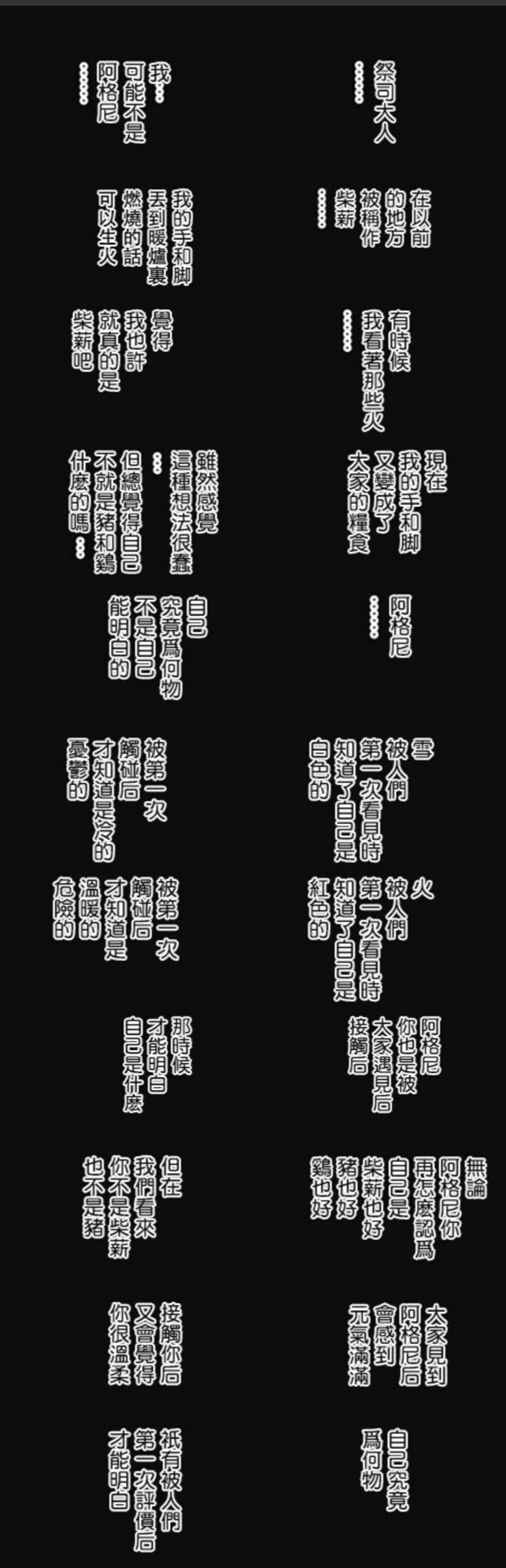 而下方的奈奈特也在此刻說出了她作爲旁觀者看見的真正的阿格尼,他只是一個渾身覆裹着烈焰,終日求死不得的可憐的人。