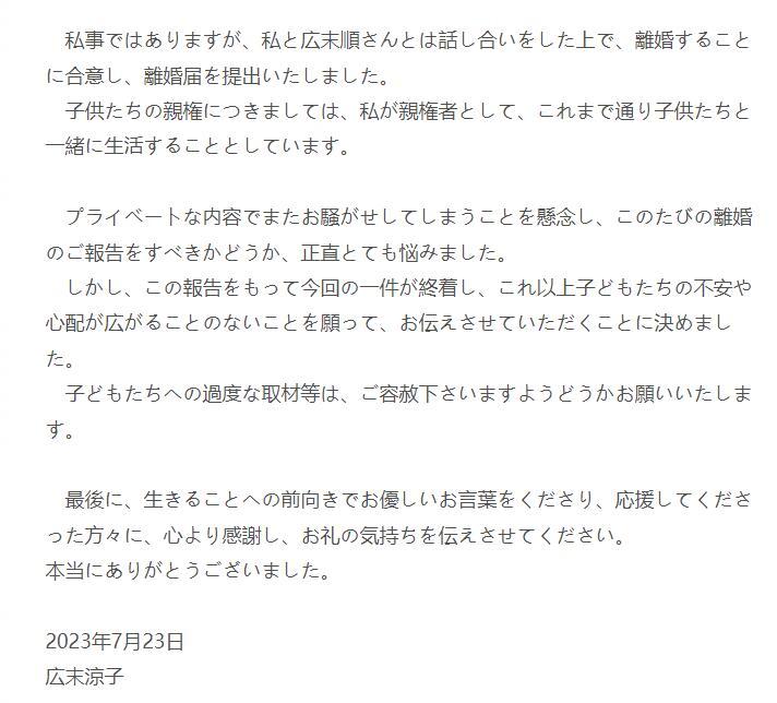 據日媒消息,日本影星廣末涼子今日通過事務所宣佈離婚。她在離婚聲明中稱,“我和廣末順先生在溝通後雙方同意離婚,關於孩子的監護權,我將繼續作爲監護人與孩子們一起生活。”