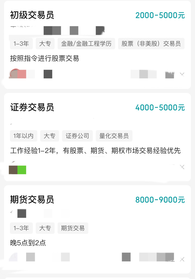 这种岗位前期都有一周无薪培训,考核过了可以留下,考核不过就走人。如果兄弟们真想入这行,提前想好了,你到底是不是玩金融的脑子!这种岗位薪资很低三千块的薪资要你在电脑前坐一天盯着股市,你的薪资涨幅跟着你组长的实力走,你组长牛你一个月可以多赚一点,你组长垃,那你就要付费上班了。什么大牛带你,牛你妹!