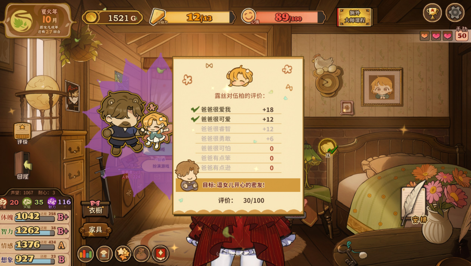 父亲的所作所为,言行举止都会影响女儿对父亲的评价及女儿的属性加成。
