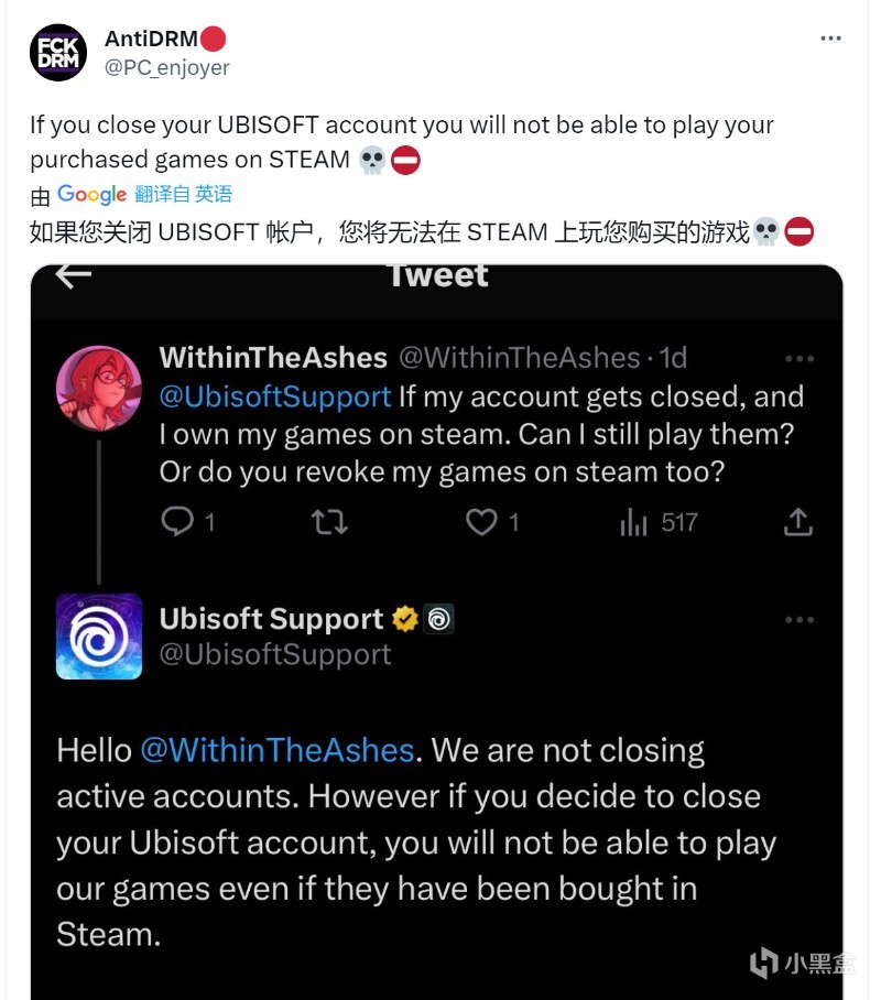 育碧账号被注销,Steam上育碧旗下游戏也将受到牵连!前日老基德报道了一则有关育碧账号不活跃将被官方注销的消息,今天网上又曝出了一则新消息