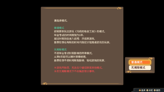 五年的时间,意味本作是有时限系统的,即使原版的流程甚至只要游戏内几天的时间就能达成普通结局,但这仍会给玩家带去无法合理安排时间导致失败的紧张感,也因此这个颇具诟病的系统在最新的炼金系列中已然被淘汰。GUST虽然在重制版保留了时限系统,但还是留下了后门,不喜欢这种紧张感的玩家可以在游戏开始选择无限期模式,在游玩期间时间将不具有意义,你可以做任何你想做的事情,哪怕是直接睡上几年,在达成对应的条件后就可以观看不同的结局,但需要的注意的是,达成后的条件是不可逆的,并且有些事件在无限期模式中不会触发,建议有追求全结局的玩家先游玩一遍普通模式再继承到无限期。