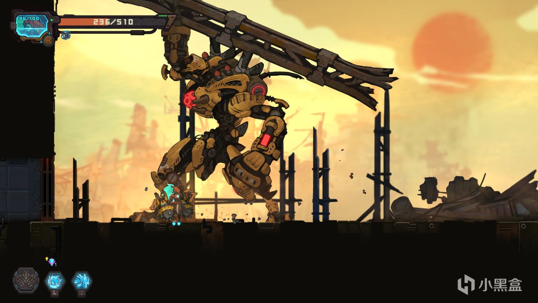 然后我们可以发现其中的内容可以分为两块:一块是如何规避攻击,并且完成攻守转换。比如对于《黑暗之魂》或者类魂游戏,就是“闪避、当身”构成了基础的二择:黑魂中的当身是弹反,只狼的当身是弹刀、血源的当身是枪反等。除了“当身”的强化攻防转换的设计思路,对于大部分横版动作游戏而言,见招拆招的“打立回”则成为了主流玩法,在《湮灭线》中,首先是覆盖了全部的主流选择——机甲的红色技能包含了“升龙拳”,可以起到误无伤防反然后反打的效果。