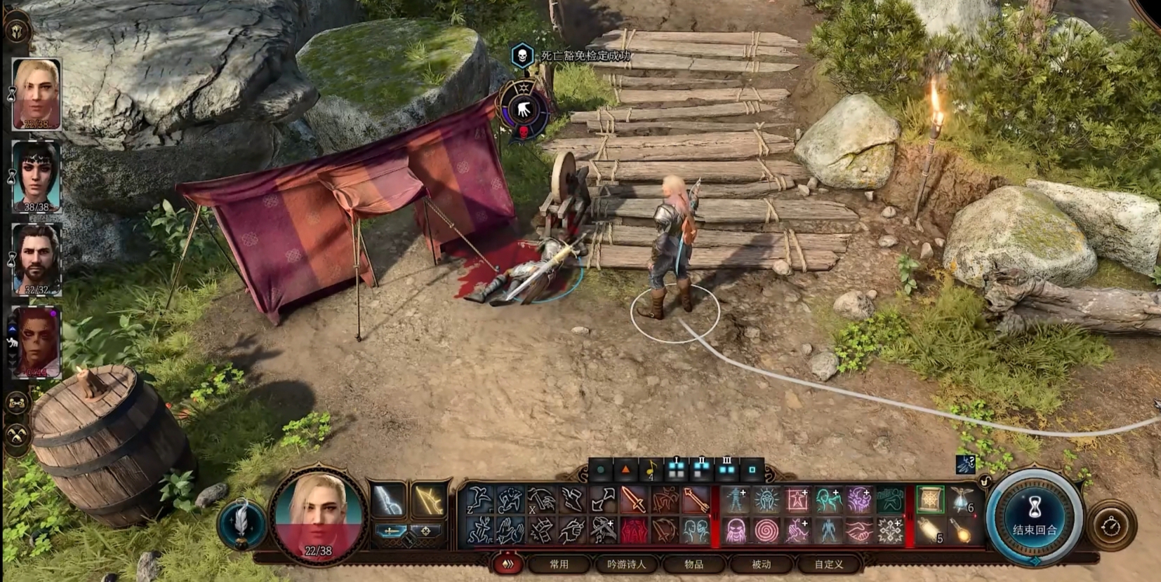 當一個友方角色生命值歸零時,他會進入死亡檢定,每回合進行一次,三次成功後會進入穩定狀態,不再進行死亡檢定。三次失敗後會死亡,可以通過回生術復活。死亡檢定狀態可以通過隊友的治療效應或者協助技能來脫離,注意穩定狀態仍然需要治療或協助來脫離。