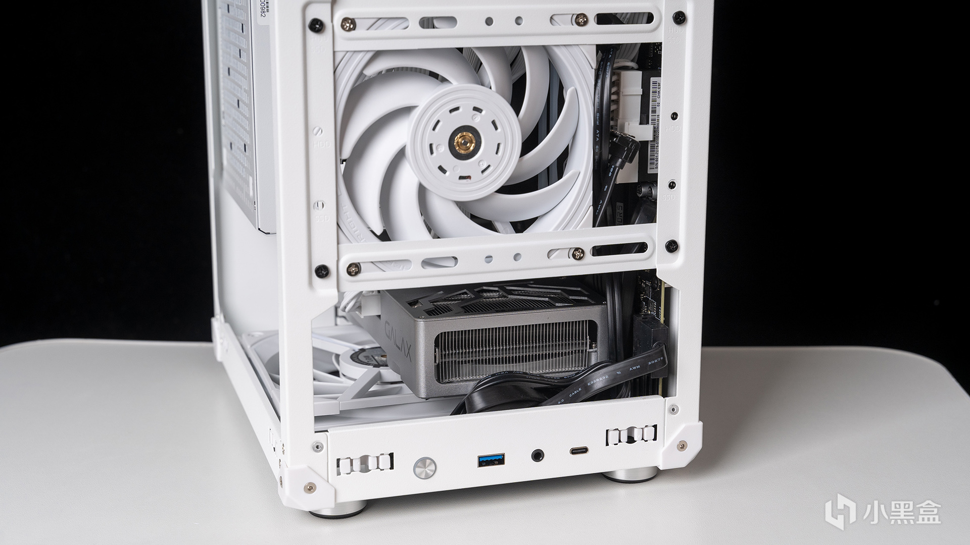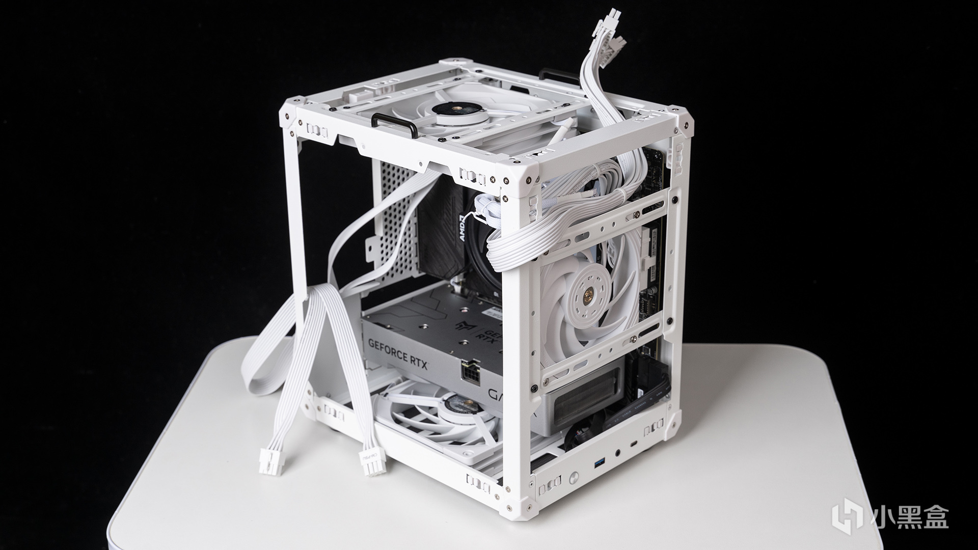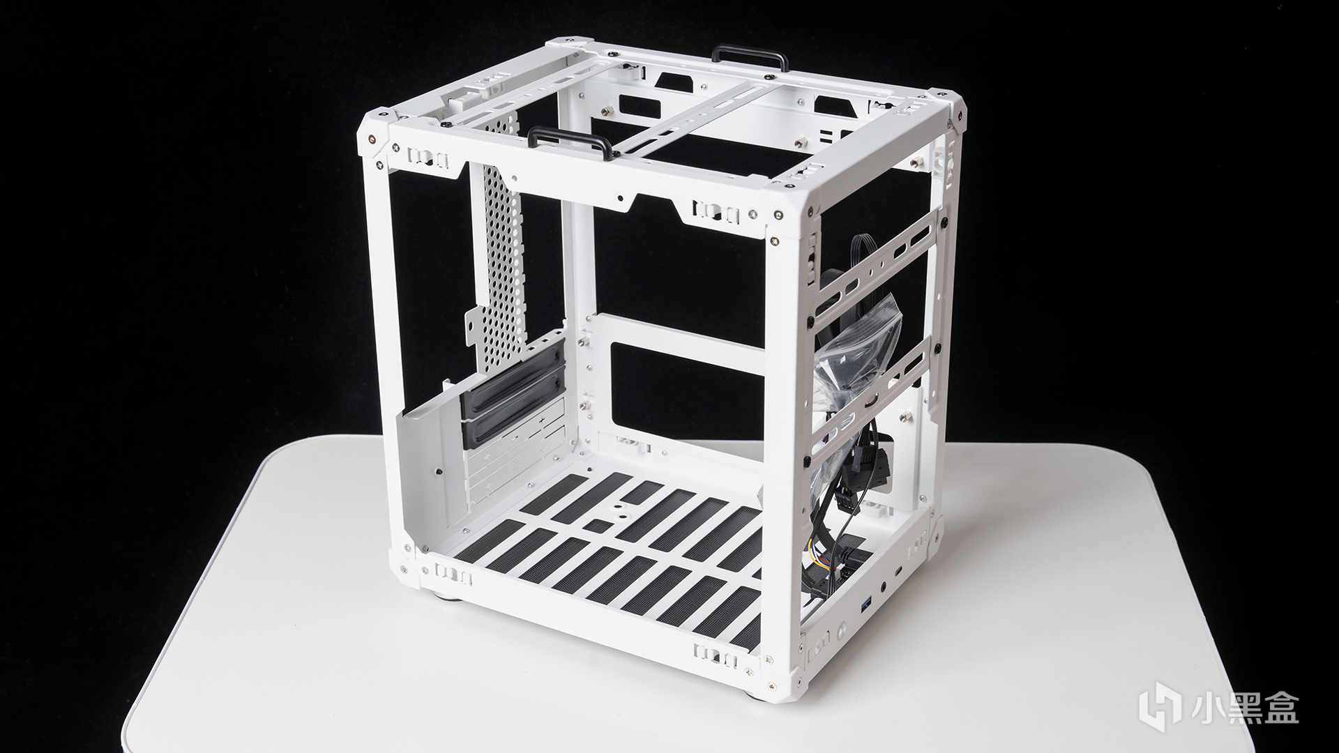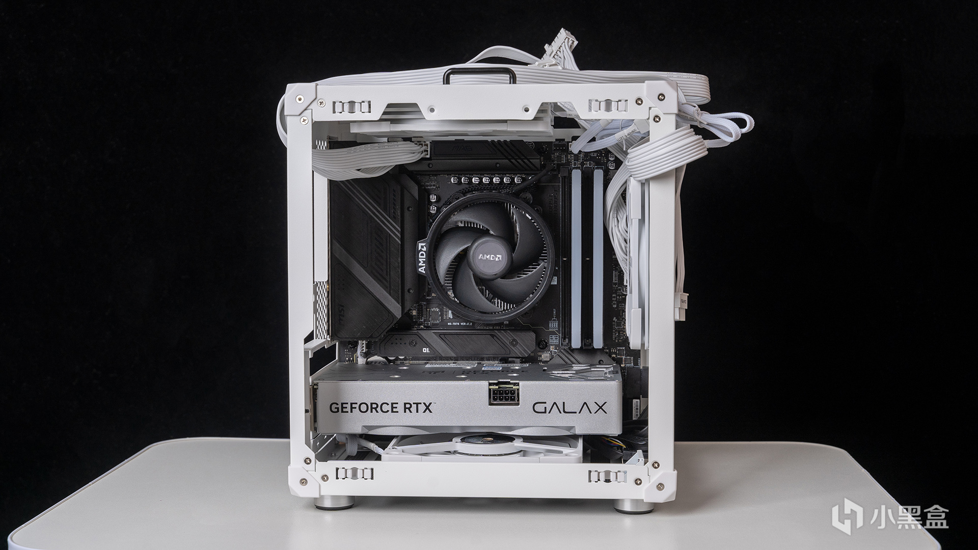這款主機安裝還是有一定講究的,供電、主板I/O線材安裝順序得考慮在前,模組電源相對來說會方便不少,由於線材非定製長度,在這個橫置懸掛電源機箱結構中也是相當凌亂,不過正如它四面洞洞板的設計,蓋上就完事了。