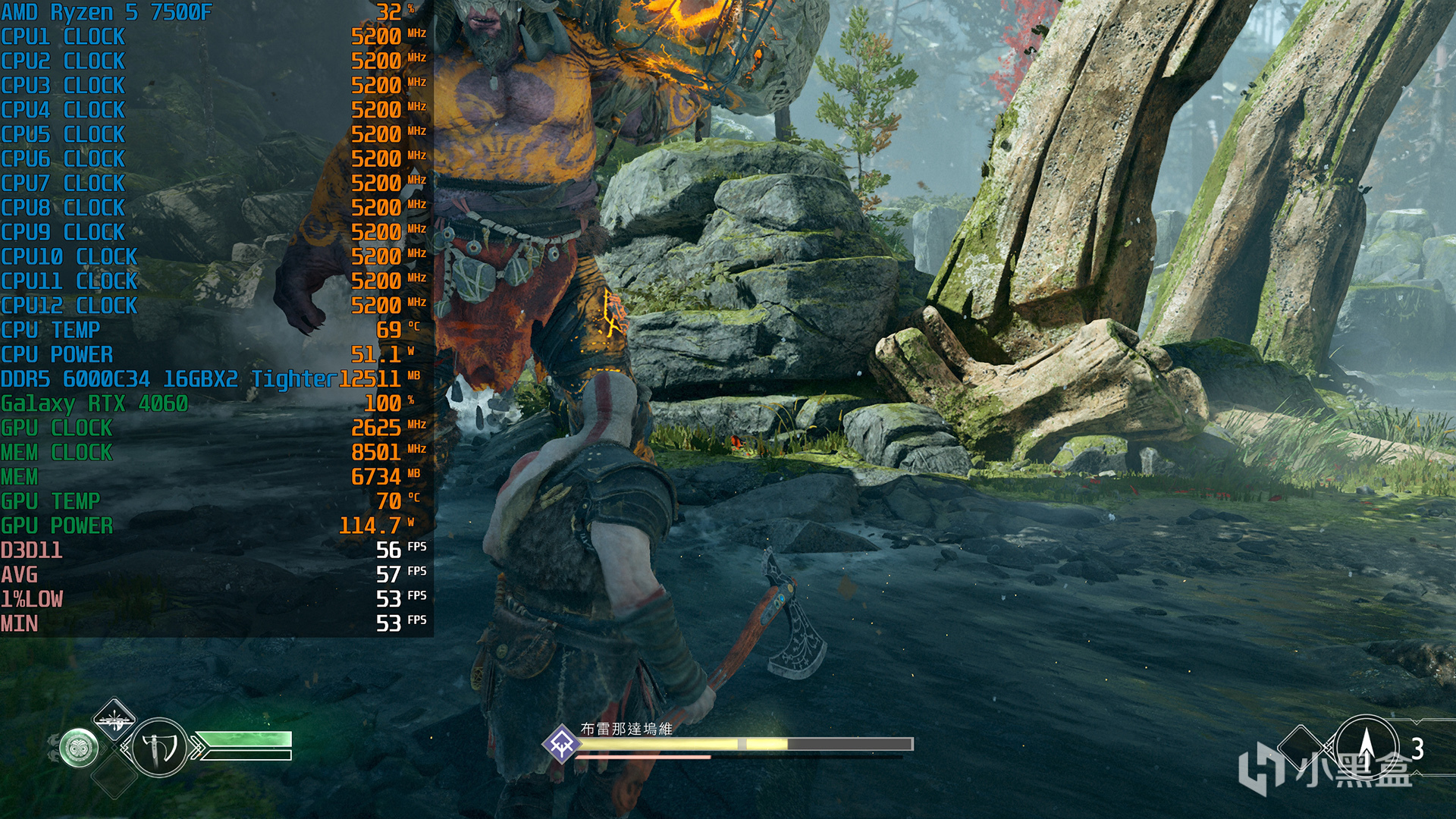 《戰神4》2K超高畫質,銳龍5 7500F OC 5.2GHz+RTX 4060金屬大師OC平均幀率爲57fps,CPU溫度爲69℃,功耗51W,顯卡溫度爲70℃