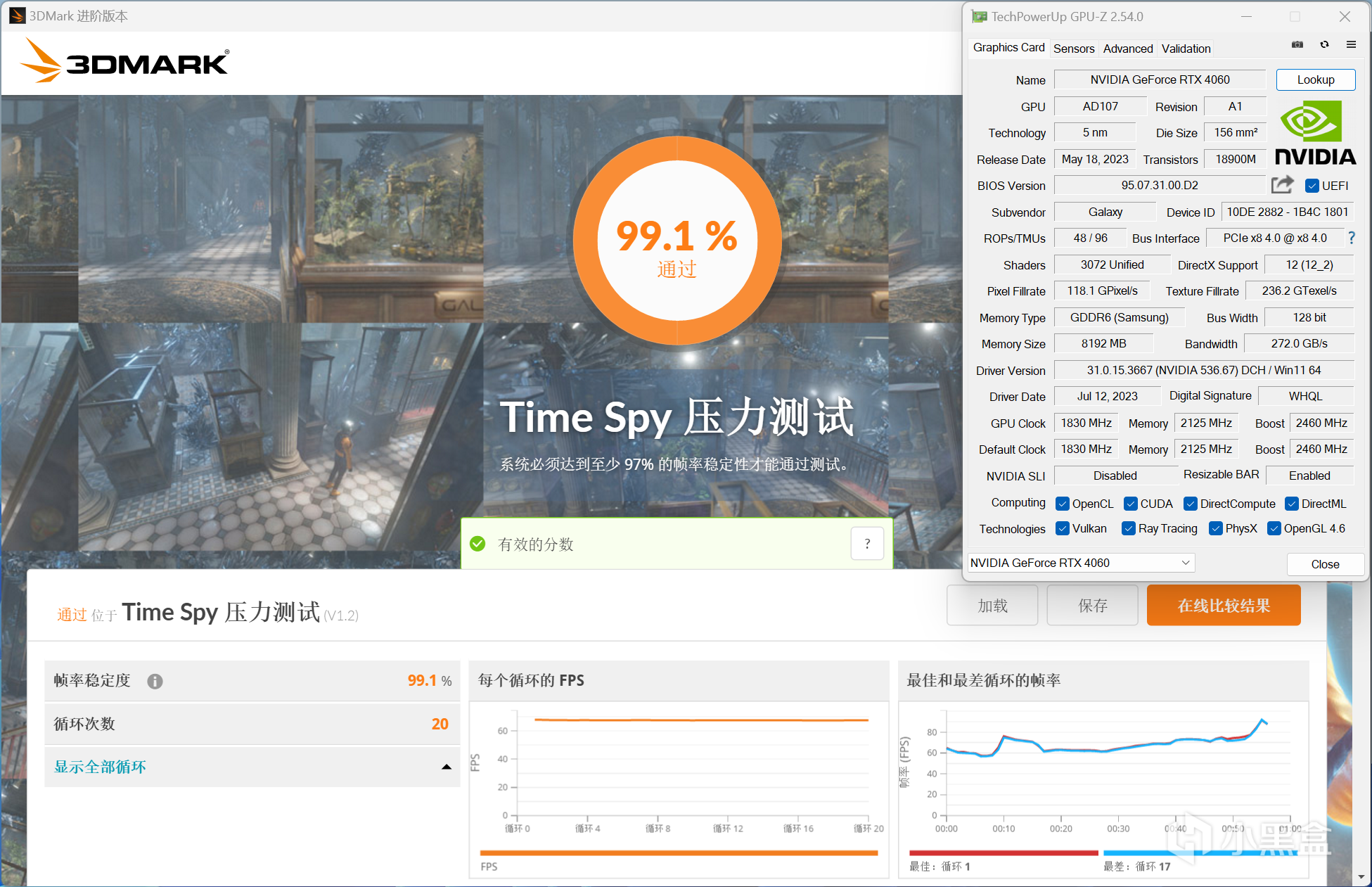 RTX 4060金屬大師OC能順利通過Time Spy壓力測試,穩定度達到99.1%,表明Boost頻率浮動不大。由於篇幅關係,這次測試CPU和顯卡溫度表現(封箱27℃空調房)可在以下五款遊戲中查看,也更有參考價值。