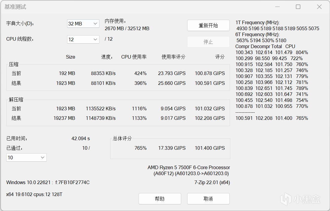 7-ZIP壓縮和解壓縮,銳龍5 7500F OC 5.2GHz 壓縮速度爲88353 KB/s,解壓縮爲1148739 KB/s,其中壓縮性能相比沒有超頻時提升7%,較爲明顯,這類項目就是關聯內存性能的。