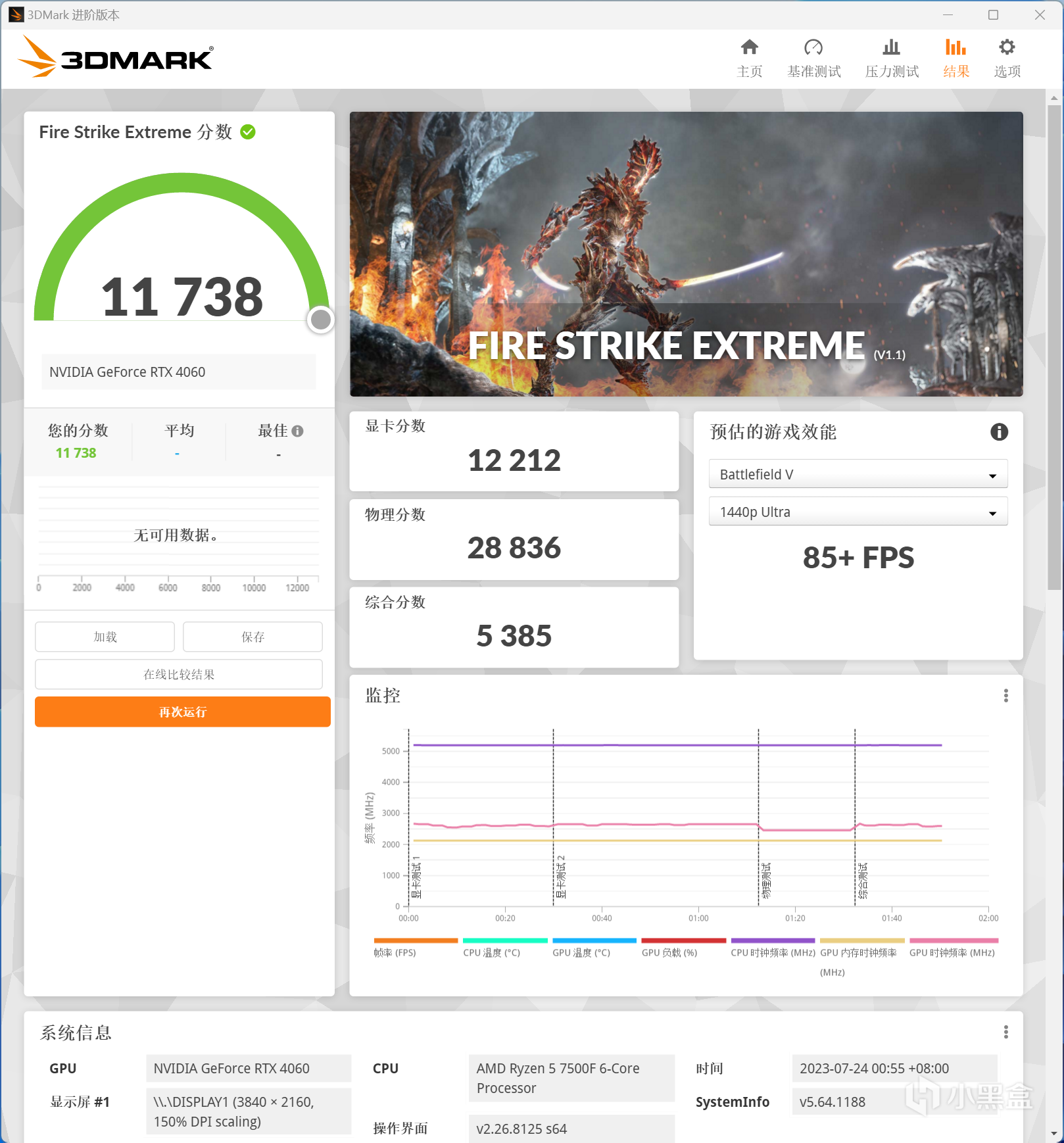 3DMark Fire Strike Extreme項目,銳龍5 7500F OC 5.2GHz+RTX 4060金屬大師OC顯卡分數爲12212,CPU分數爲28836