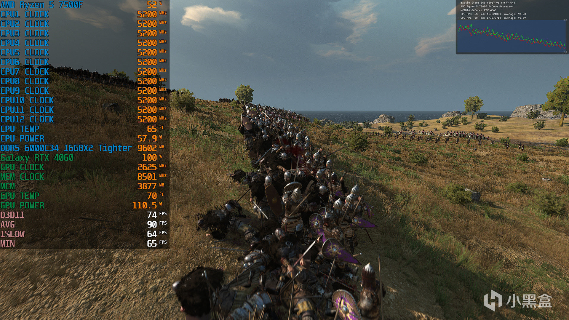 《騎馬與砍殺2》2K非常高畫質,銳龍5 7500F OC 5.2GHz+RTX 4060金屬大師OC平均幀率爲90fps,CPU溫度爲65℃,功耗58W,顯卡溫度爲70℃