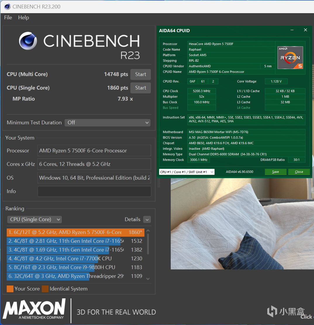 CINEBENCH R23分數,銳龍5 7500F OC 5.2GHz 單核分數1860 pts,多核分數14748 pts,單核和多核分別提升2.8%和4.3%,實際成績已經超越7600,不過距離7600X還挺遠的。
