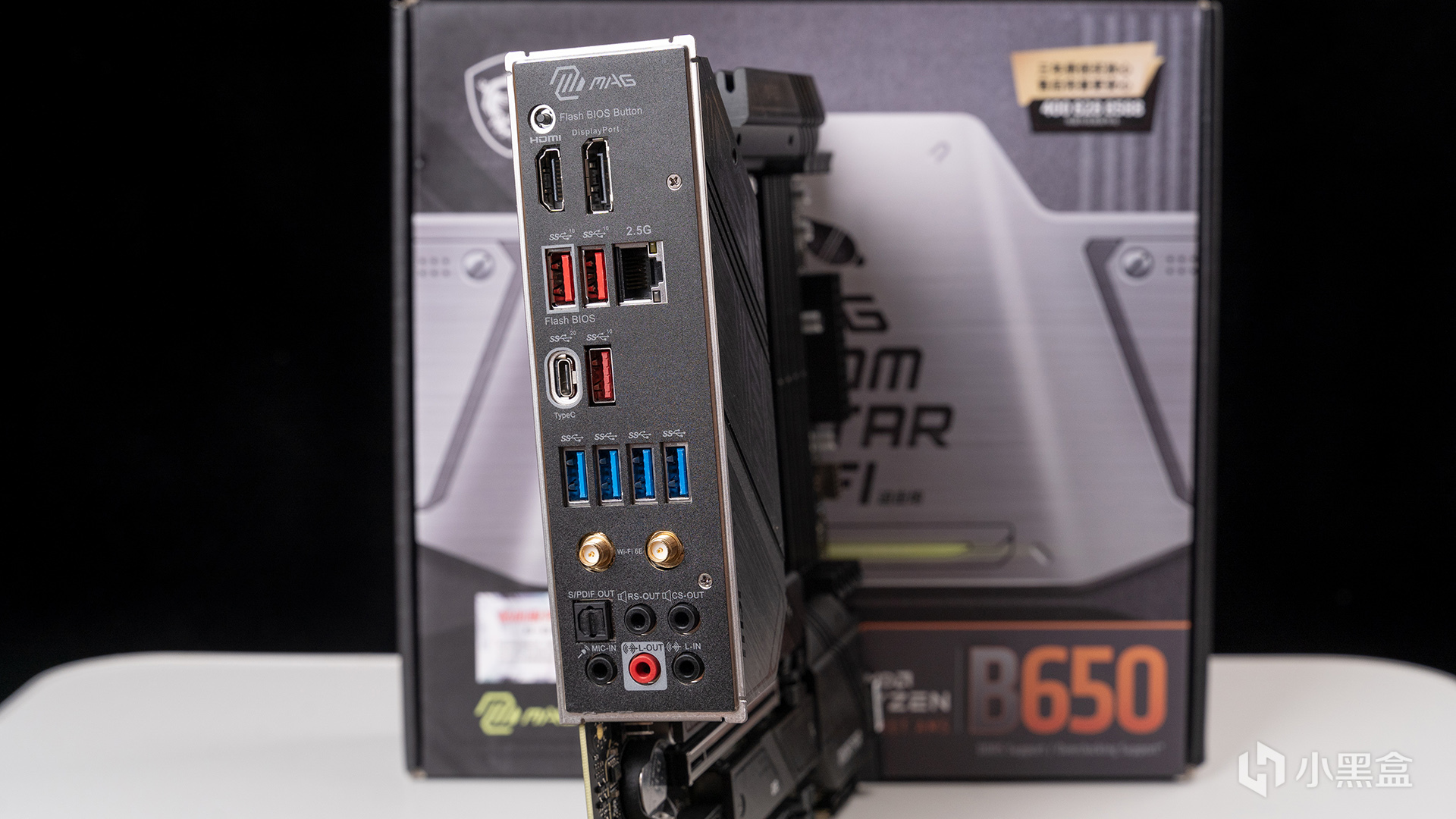 I/O部分自帶擋板設計,B650M迫擊炮擁有多達8*USB A和1*USB C常用接口,除此之外2.5網口、Wi-Fi 6E、Flash BIOS按鈕等配置都是一應俱全。