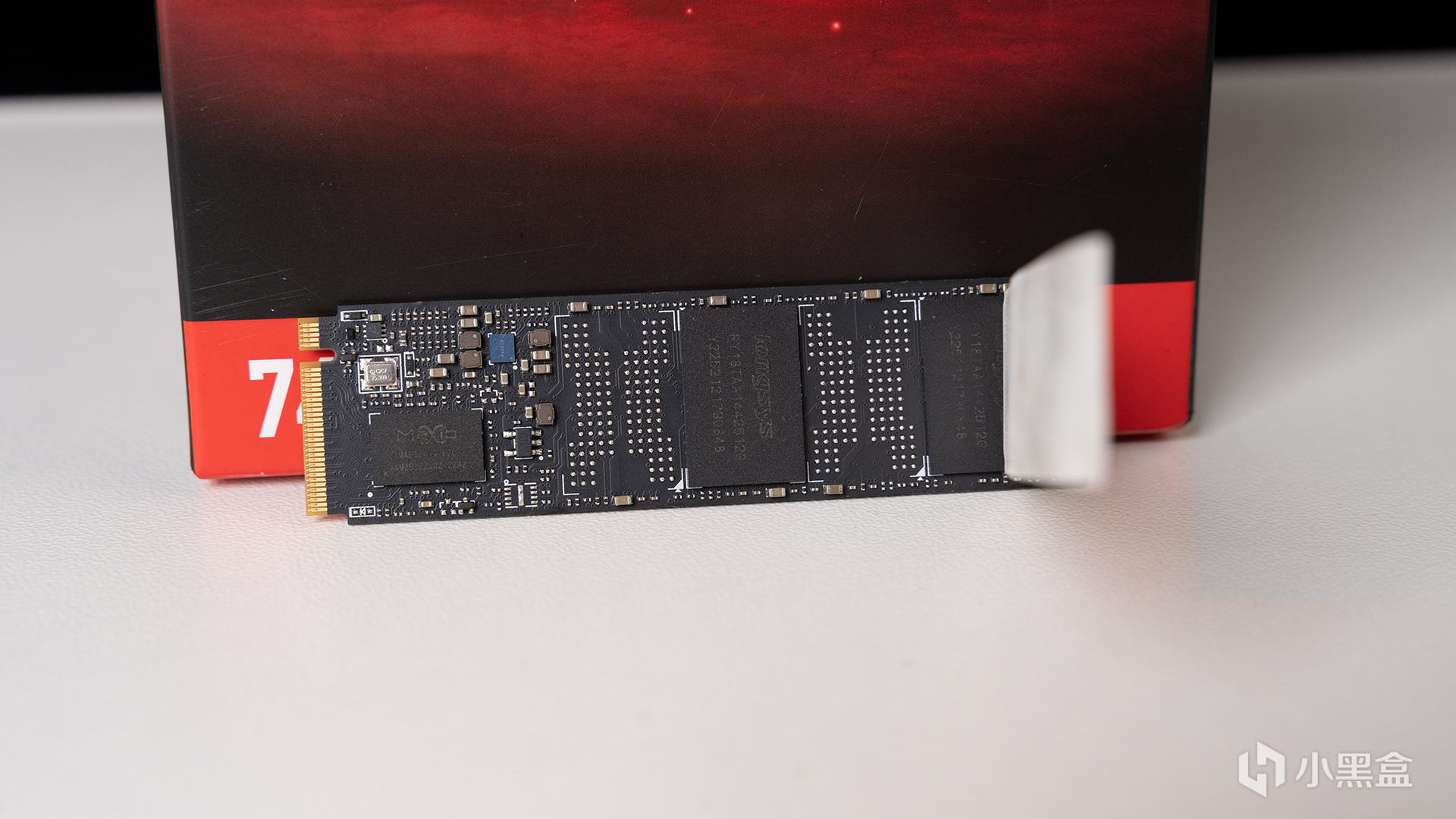 SSD屬於標準M.2 2280規格,本體採用同樣暗紅色風格的超薄散熱片,材質是石墨烯材質,能提供一定導熱效果且厚度宛如一張紙,可適用於各種安裝環境不受限制。