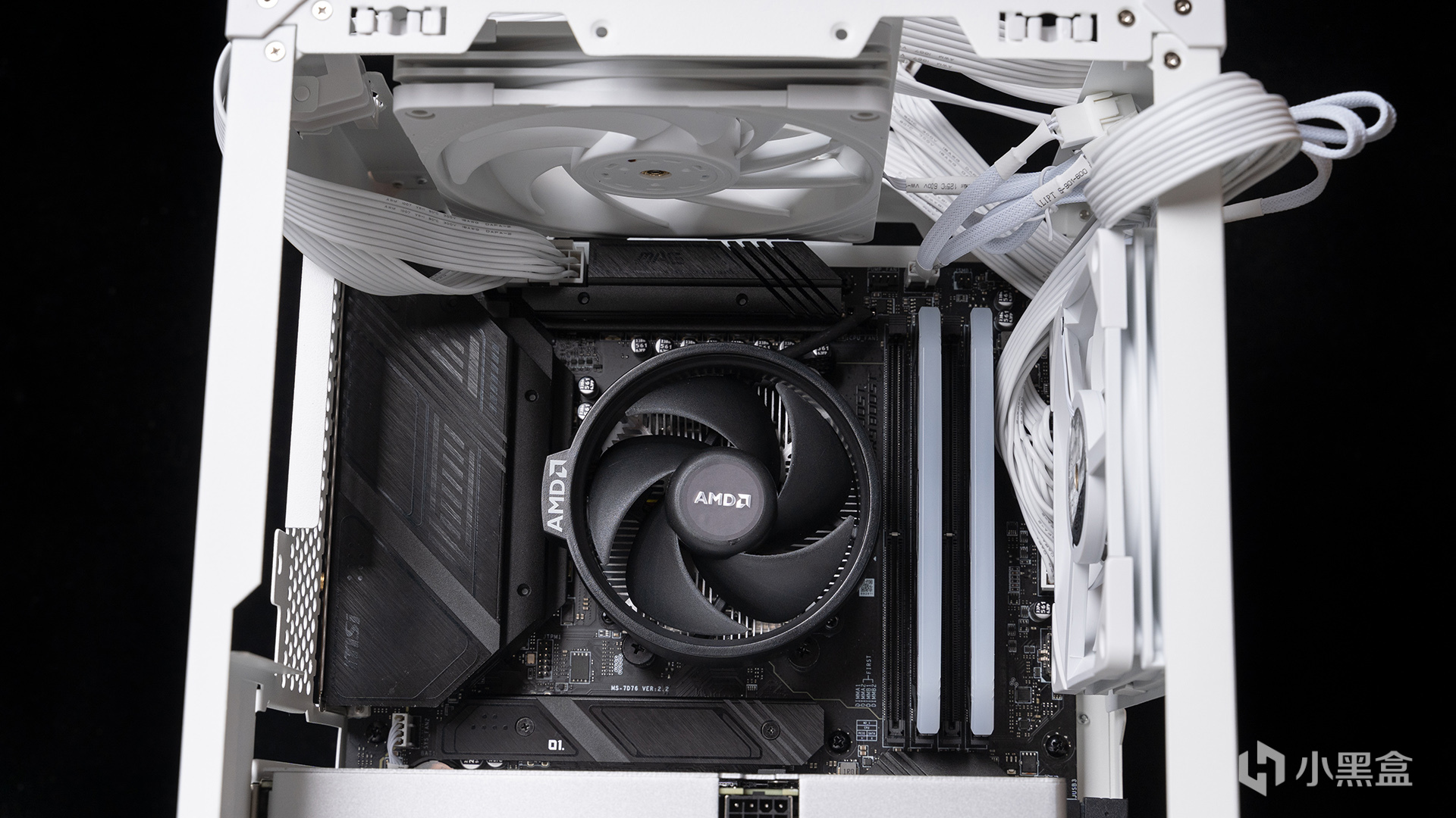 前置安裝的風扇是進風的,對於距離相近的內存相當友好,不過安裝完成後電源和其線材遮擋面積相當大,硬核對於本次上置風扇排風持保留意見,其實不一定比進風方式效果好,畢竟CPU散熱器還是下壓式的。