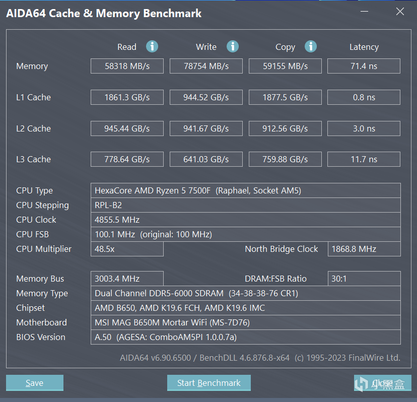 AIDA64內存和緩存測試,銳龍5 7500F搭配DDR5 6000C34 16GBX2性能表現