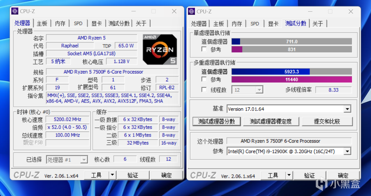 CPU-Z參數,銳龍5 7500F OC 5.2GHz 單核分數爲711,多核分數5923,前者基本緊追7600,後者已經完全超越7600,不過CPU-Z分數一向波動較大,僅供參考。