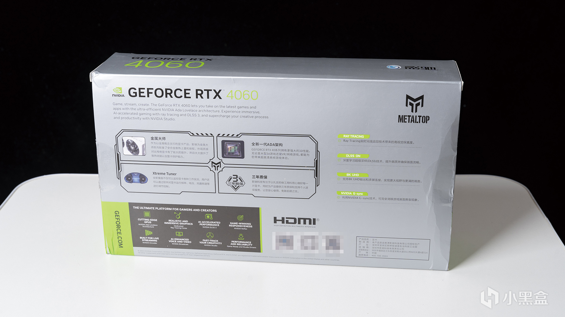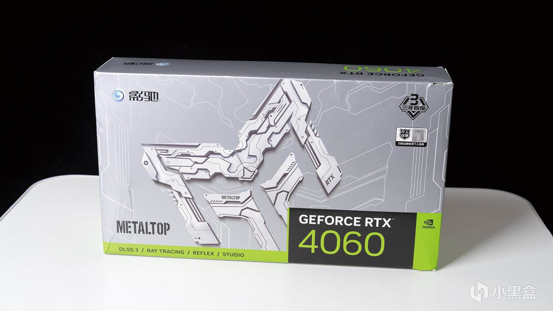 這次裝機定位本來就是小主機方向,對顯卡性能要求不會太高,在不僅限於遊戲用途情況下,這款影馳RTX 4060金屬大師OC就是不錯的全能選擇。包裝採用經典金屬大師LOGO作爲主視角,上方標註三年質保和支持個人送保,售後服務相當不錯的。