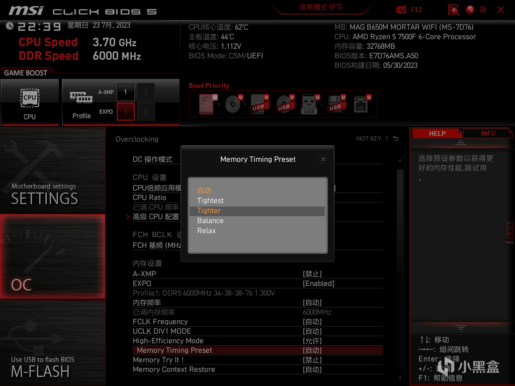 所以硬核推薦大家使用微星AM5主板BIOS內置了High-Eiffciency Mode(高性能模式),一鍵自動微調小參,輕鬆增強內存性能很方便,實測ARES RGB DDR5 6000C34這款內存在Tighter檔位穩定運行,後續有性能對比,你就知道爲什麼本人強烈推薦使用該功能。