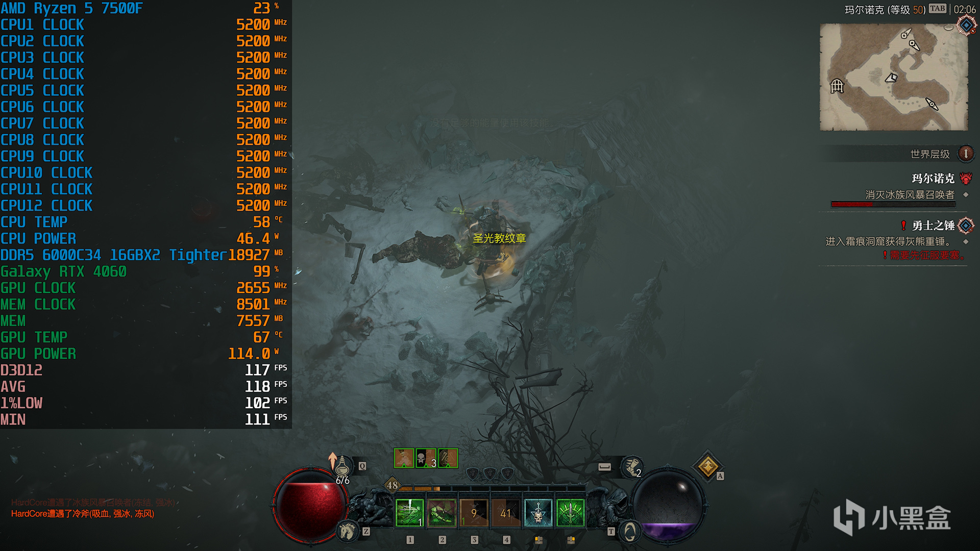 《暗黑破壞神4》2K極佳畫質+DLSS 3質量(幀生成),銳龍5 7500F OC 5.2GHz+RTX 4060金屬大師OC平均幀率爲118fps,CPU溫度爲58℃,功耗46W,顯卡溫度爲67℃
