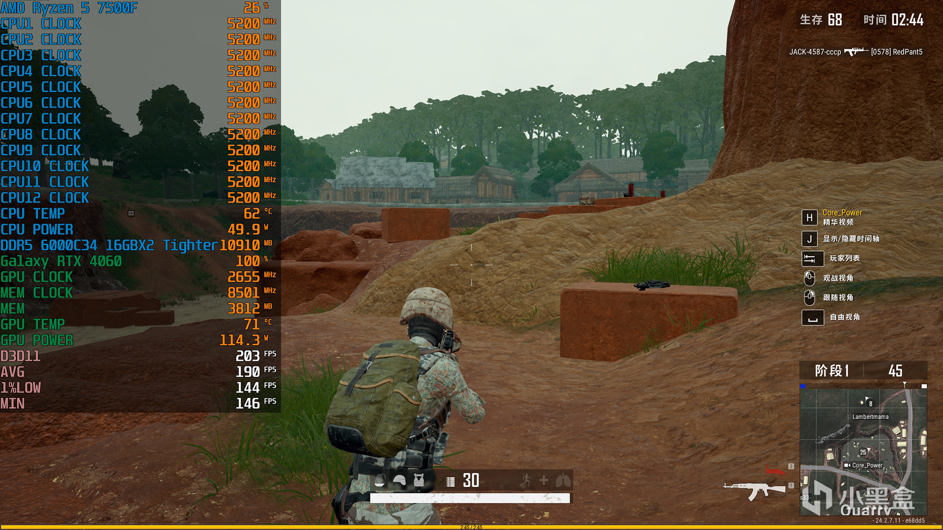 《絕地求生》2K三超高+120%渲染畫質,銳龍5 7500F OC 5.2GHz+RTX 4060金屬大師OC平均幀率爲190fps,CPU溫度爲62℃,功耗50W,顯卡溫度爲71℃