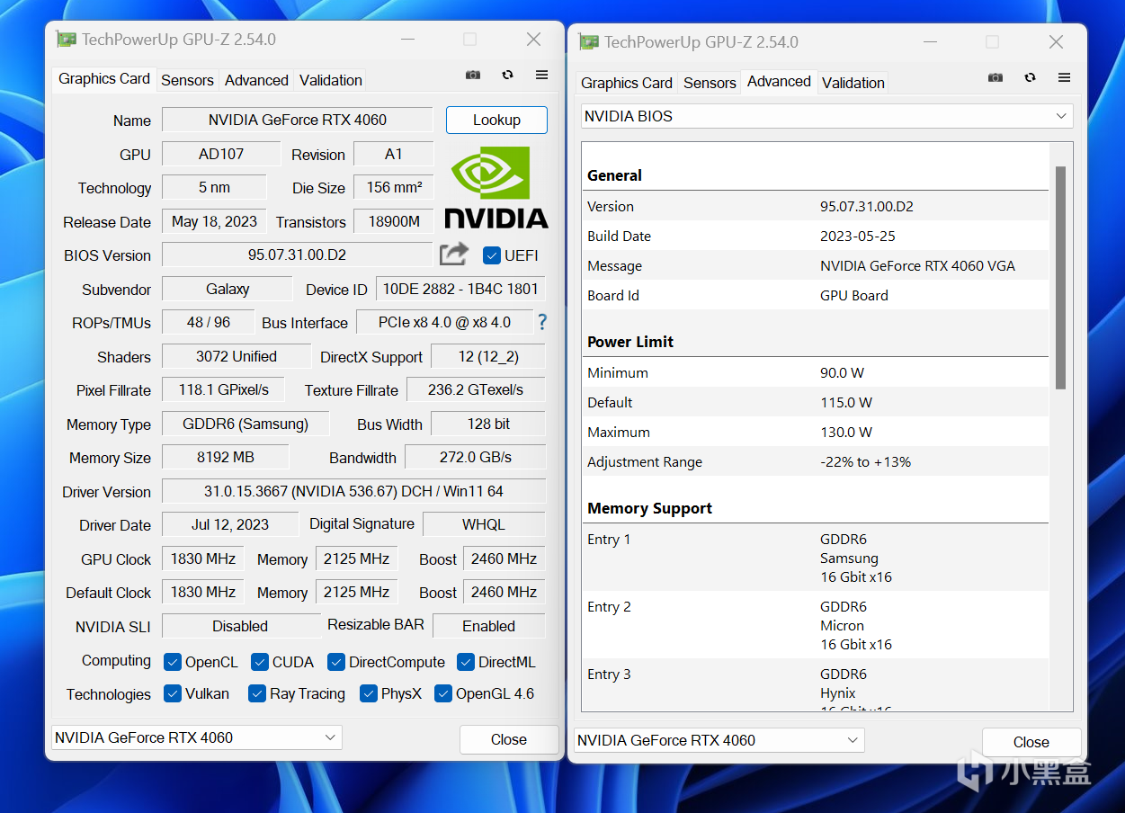 GPU-Z,RTX 4060金屬大師OC的各項參數,Boost頻率設定爲2460MHz,和大部分主流非公一致,顯卡最大功耗支持解鎖至130W,有一定的提升空間,說下本次測試環境,操作系統是最新Windows 11 22H2,NVIDIA驅動是536.67 Game Ready WHQL,並在BIOS中開啓Resizable BAR技術提升一些顯卡性能。
