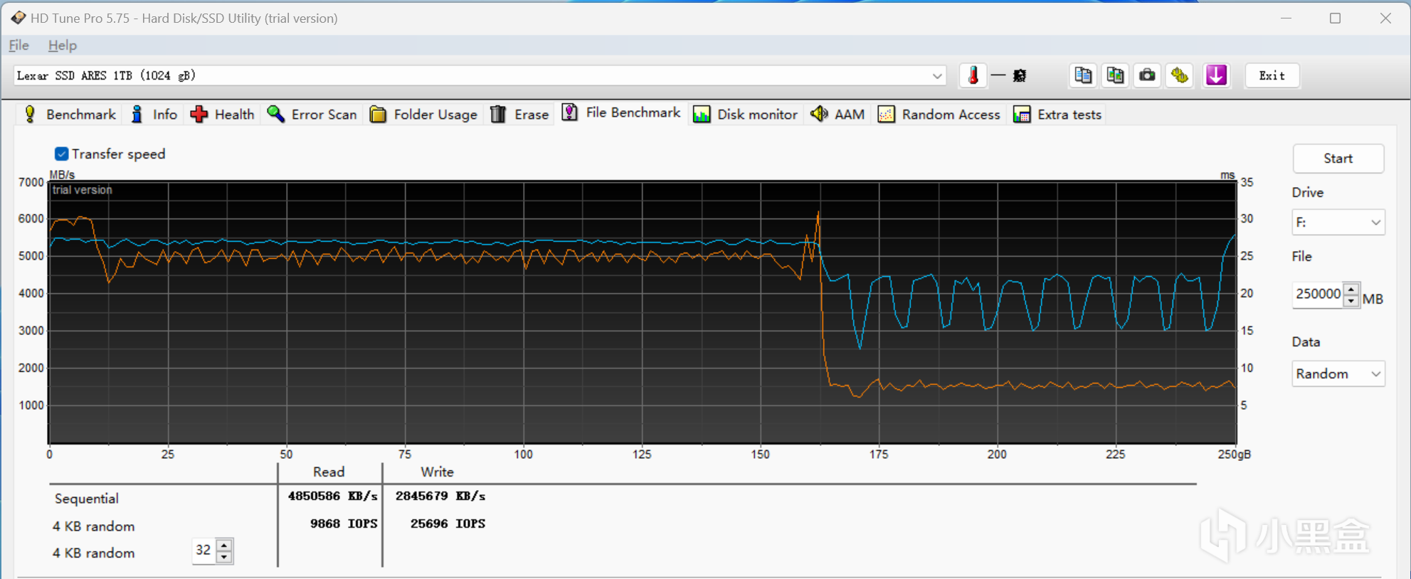 在HD Tune Pro中對雷克沙ARES 1TB寫入250G超大文件,顯然HMB 3.0緩存機制發揮了重要作用,大概在163GB之後纔出緩外,緩外速度可持續1500 MB/s左右,對於大部分用戶來說根本用不完。