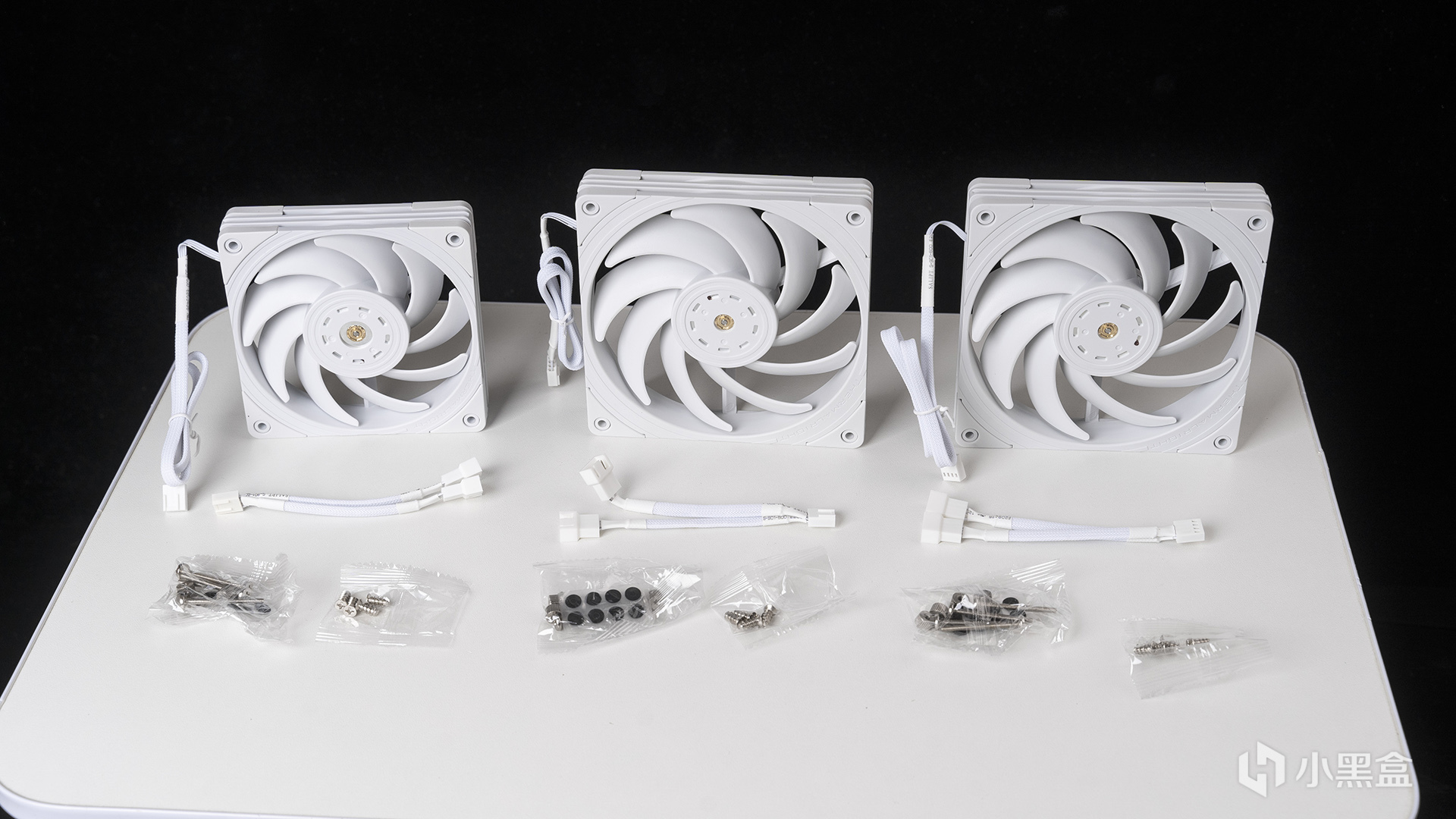 正如上述結構圖所見,喬思伯C6這款機箱一定得安裝風扇,這款準備了利民TL-B14W*2+TL-B12W*1風扇組合,屬於單價過百元的高端扇子,有二次點膠動平衡設計,風量和風壓數據都不錯,配件方面提供免工具螺絲和一分二供電線。