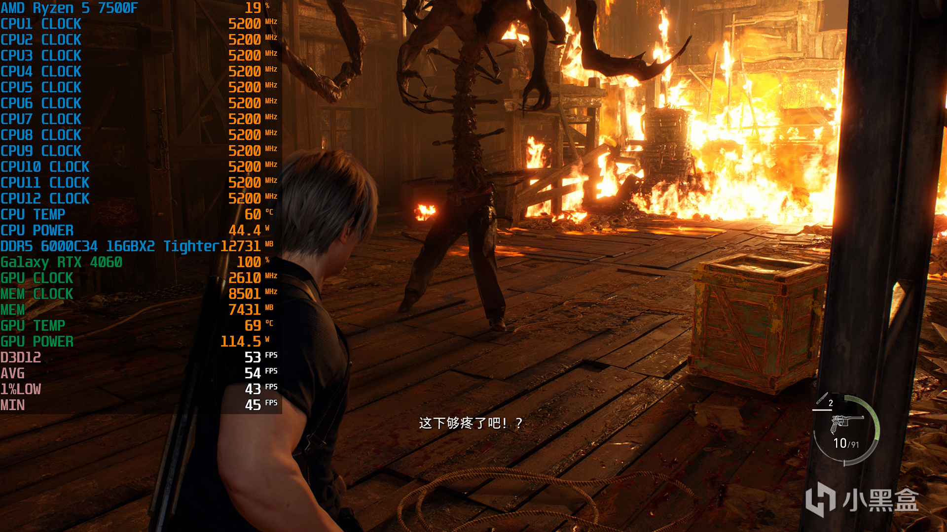 《生化危機4:重製版》2K最高畫質,銳龍5 7500F OC 5.2GHz+RTX 4060金屬大師OC平均幀率爲54fps,CPU溫度爲60℃,功耗44W,顯卡溫度爲69℃