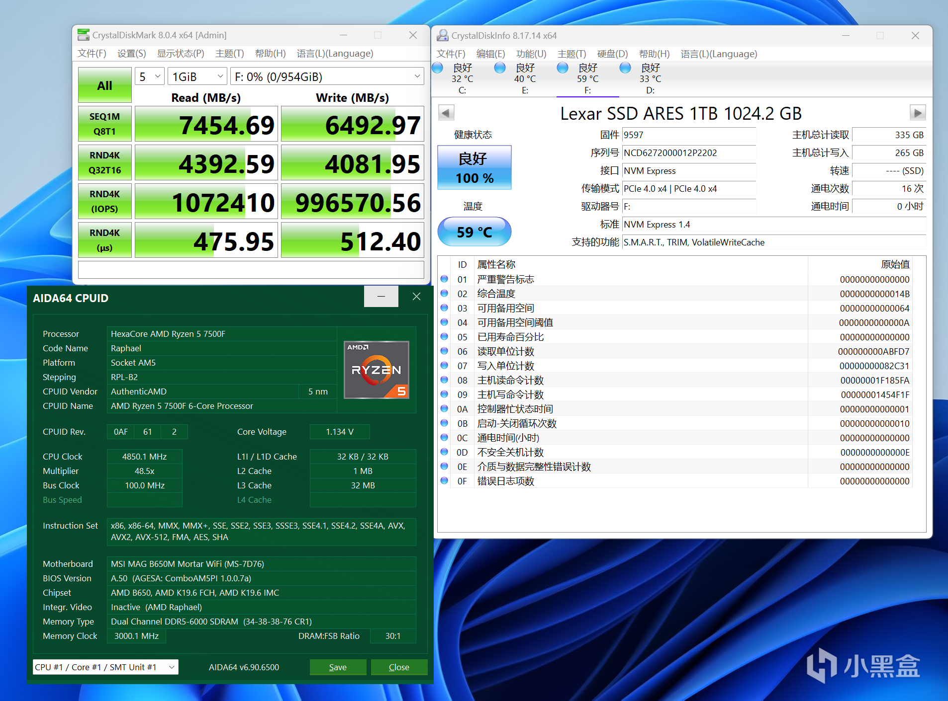 CrystalDiskMark峯值性能測試,雷克沙ARES 1TB順序讀取速度爲7454.69 MB/s,順序寫入速度爲6492.97 MB/s,完全符合官方標稱讀寫性能,甚至讀取性能還更高一些,凡是AMD處理器搭配PCIe 4.0固態都會有一點點優勢——讀取性能通常都能跑滿。