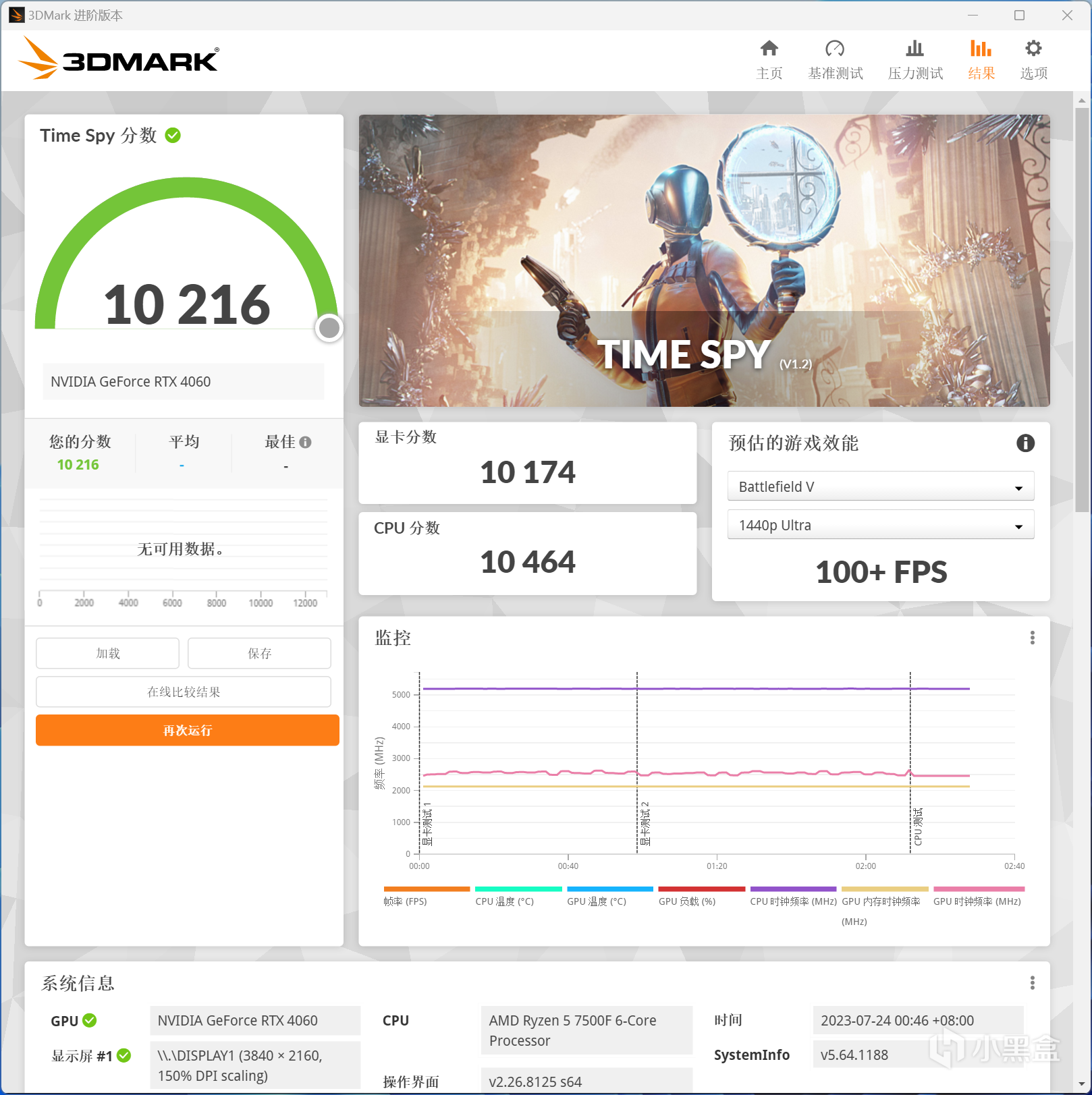 3DMark Time Spy項目,銳龍5 7500F OC 5.2GHz+RTX 4060金屬大師OC顯卡分數爲10174,CPU分數爲10464,顯卡分數相比其他超頻版RTX 4060稍低5%左右,也就是公版的水平,不過這款顯卡實際最大功耗能到130W,其實拉一拉輕鬆就能追上了。