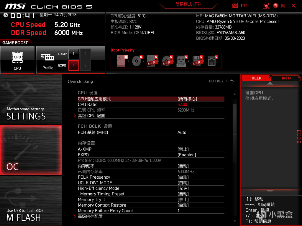 慣例測試前把BIOS刷至最新,打開EXPO技術達成DDR5 6000C34,衆所周知銳龍7000在同頻狀態一般最高可達到DDR5 6400MHz,不過需要細緻的調教,對於大衆玩家過於繁瑣。
