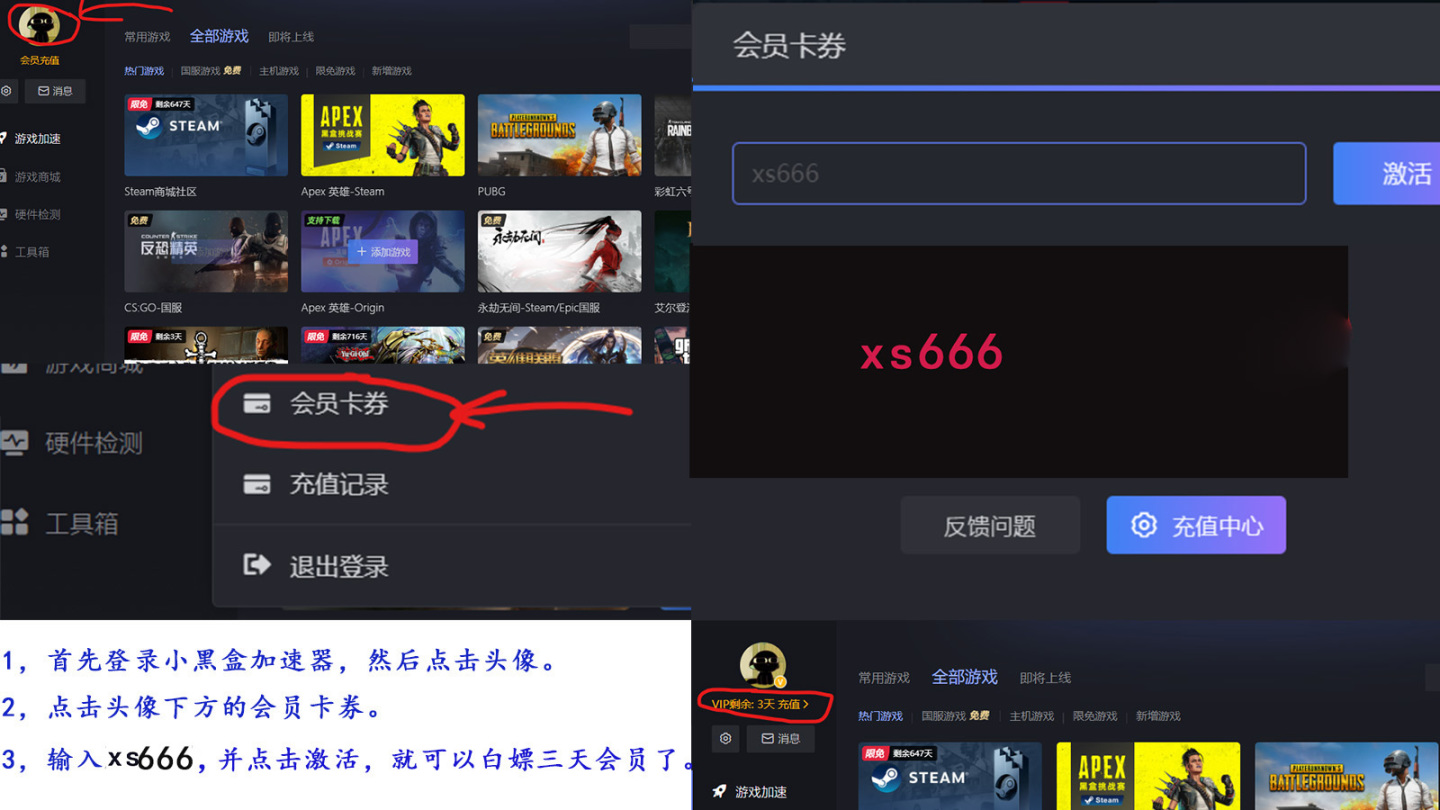 在小黑盒加速器pc端輸入xs666,即可白嫖三天會員時長。