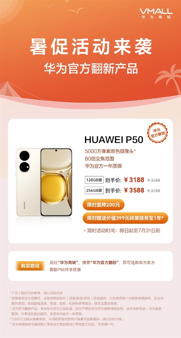 IT之家从华为商城官方微博获悉,华为官方翻新产品暑期促销活动正式开启,其中华为 P50 官方翻新版限时直降 200 元,下单还送价值 399 元的一年期碎屏服务宝,活动时间为即日起至 7 月 31 日前。