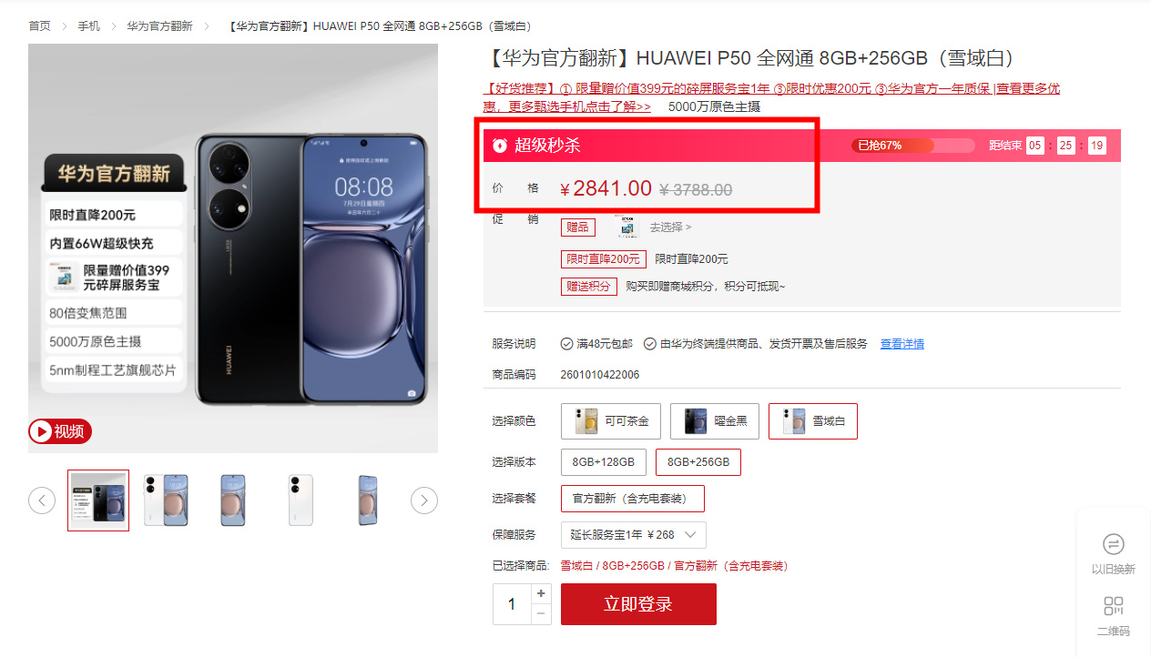 官方海报显示,降价后,华为 P50 翻新版 8GB+128GB 到手价 3188 元,8GB+256GB 到手价 3588 元。但IT之家注意到,雪域白配色的 8GB+256GB 版售价只需 2841 元,比 8GB+128GB 版还便宜,不知是否是显示错误。