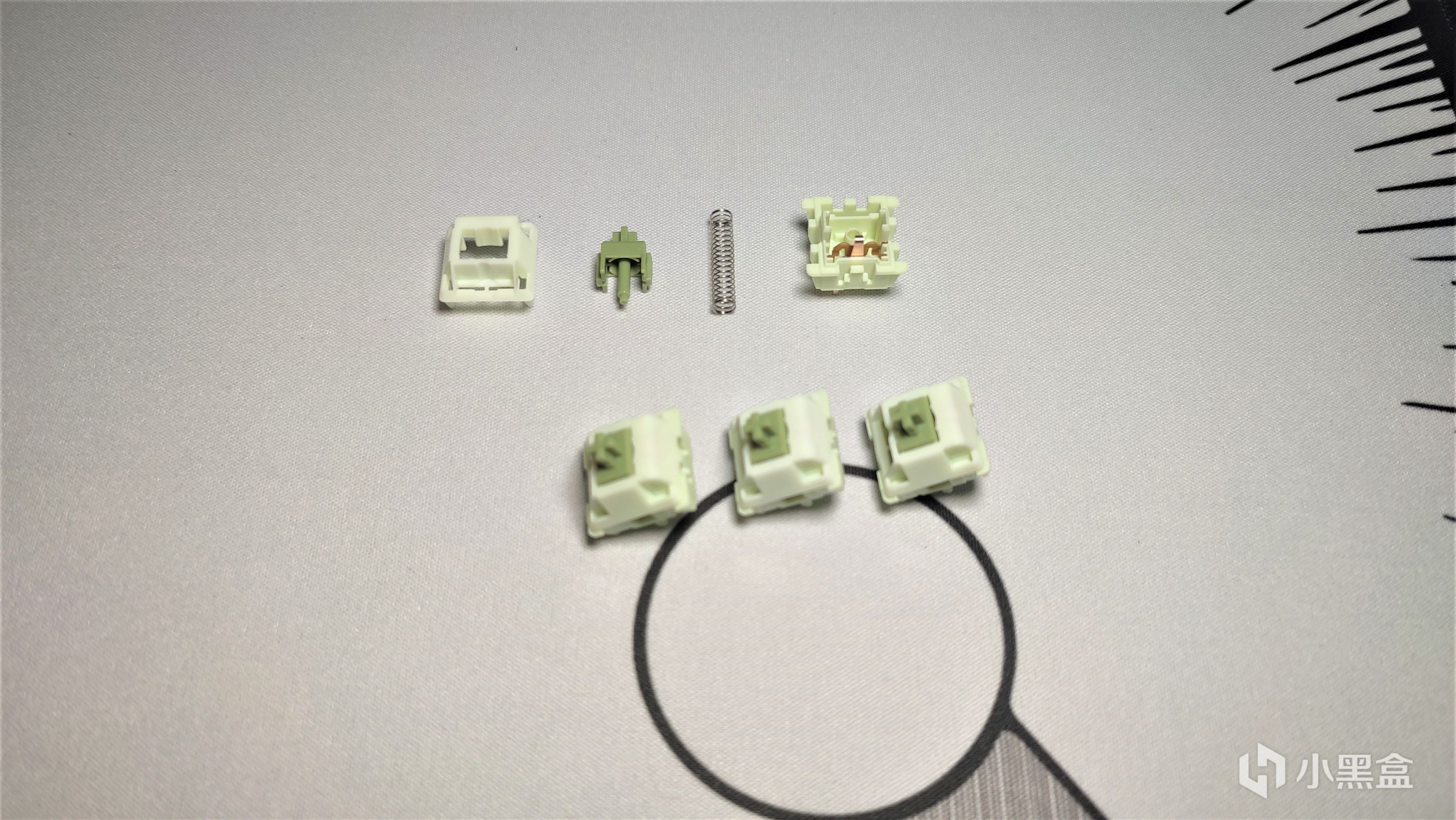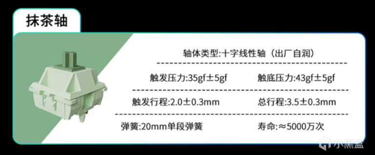 抹茶轴整体采用浅绿色配色,轴芯则是深绿,整体配色和抹茶颜色不能说毫不相关吧,只能说看着确实有那味道。轴体方案采用了目前玩家们普遍喜欢的线性轴,当然加长轴芯也没少,总行程来到了3.5±0.3mm,但是触发行程方面却保留了类红轴的行程,为2.0±0.3mm。不过在触发压力方面和类红轴对比就有差别了,仅有35gf±5gf,算一个轻压力轴。如果连红轴都觉得重的话那么也只有轻压力轴适合了。