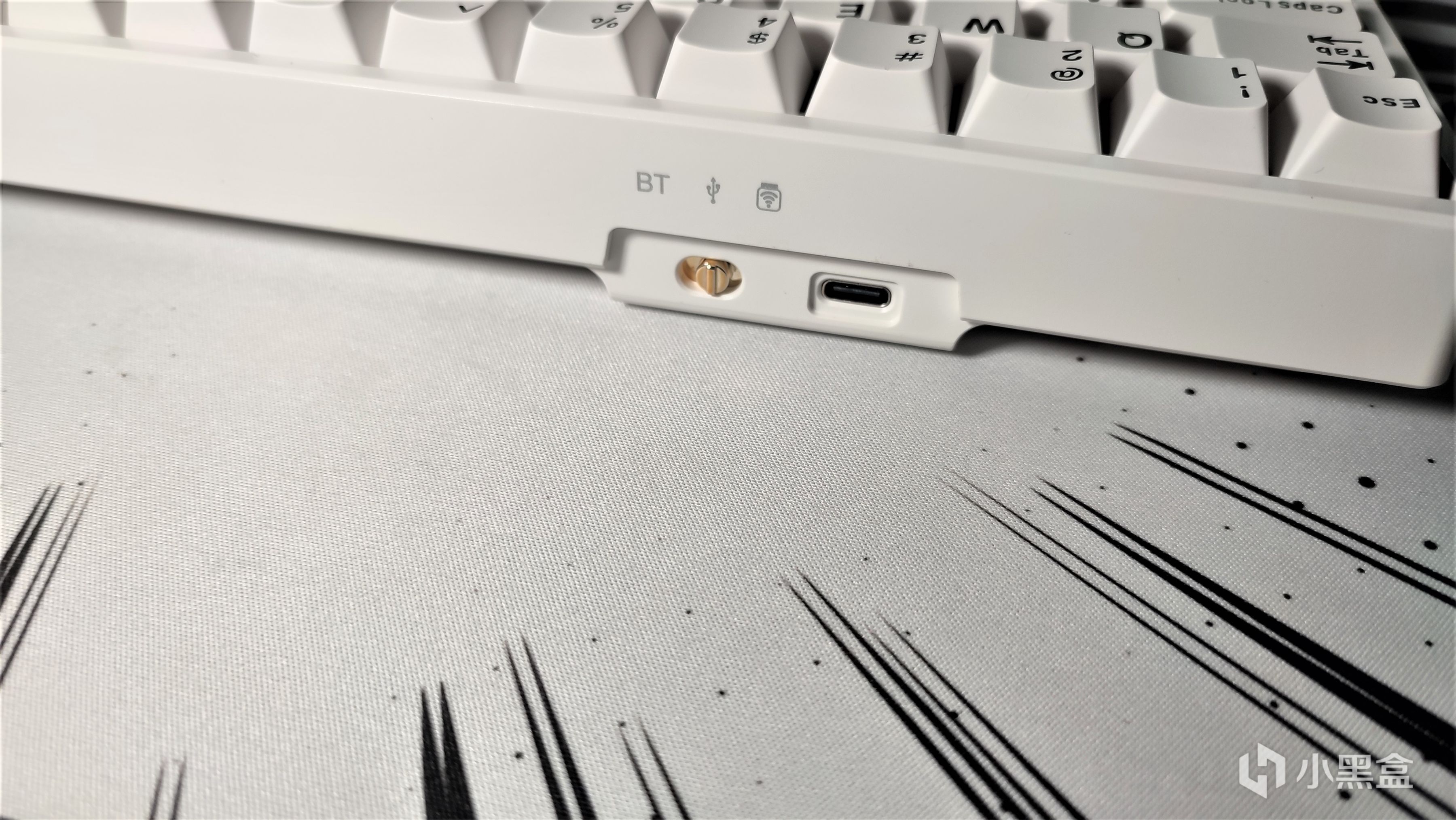后侧面能看到三模切换开关以及Type-C插口,三模对应的模式都能在上方看到,字迹处理工艺和前面介绍的名字是一样的,有点不能接受的是这个切换开关,没有采用和键盘同样的配色,而是采用金属亮面,虽然颜值确实可能提高了些,但是放到整体搭配上来看总觉得不搭。