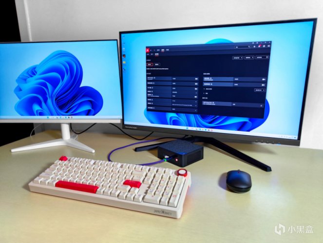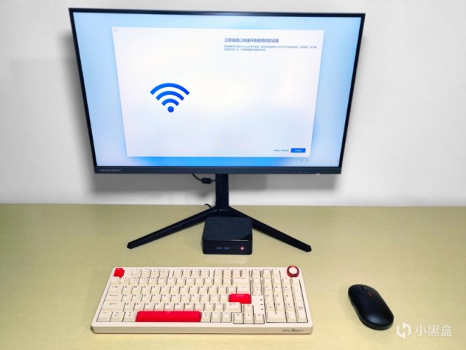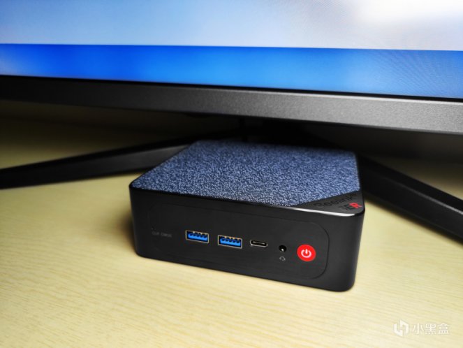 連接好電源和顯示器,便可以按下電源按鈕開機使用。這次爲了測試遊戲表現,正好用紅魔電競顯示器。