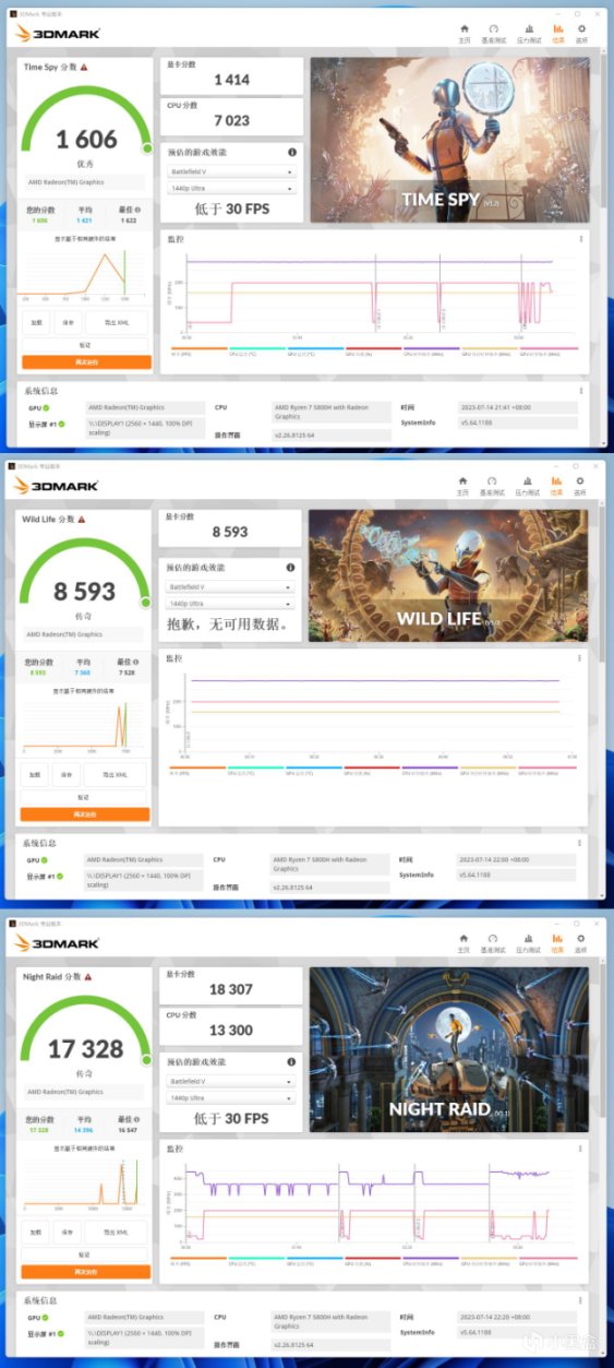 3DMark Time Spy得分1606,Wild Life得分8593,Night Raid得分17328。