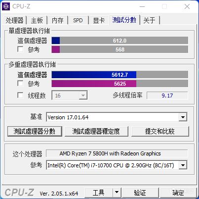 CPU-Z跑分測試單核612,多核5625。對比十代英特爾酷睿i7-10700,單核高了不少,多核差不多。