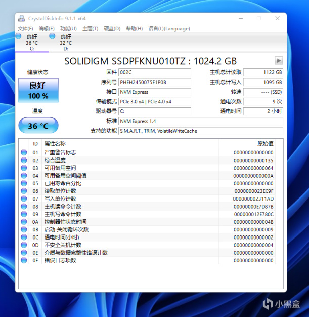這塊1TB固態通電9次,總時長2小時,支持TRIM。