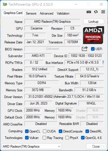 集成了AMD RADEON核顯,最大2000 Mhz顯卡頻率,共享3GB顯存。