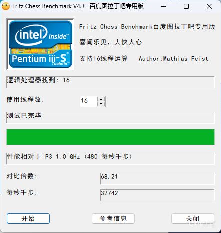 Fritz Chess相對性能倍數68.21,每秒千步32742。