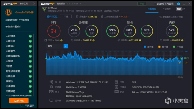 換另一個3A跑跑,GTA5可謂比較經典的了,開到比較不錯的畫質,15分鐘平均34fps比原神好點,但依然喫滿。