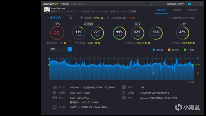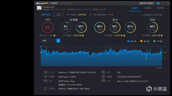 先來幾個遊戲玩玩,2K分辨率原神全高60幀,壓力挺大,顯卡喫滿,25分鐘下來平均只有22 fps,好在是全高勉強也能跑跑。