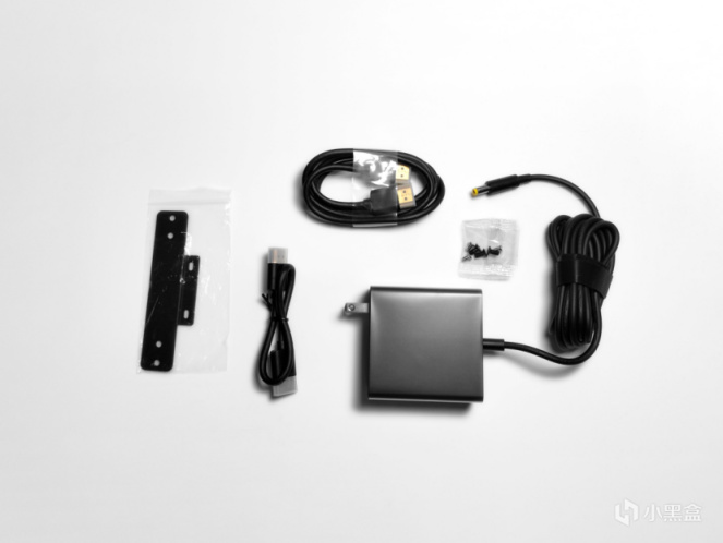 最底層則是隨機器提供的一些配件,包括壁掛支架和安裝所需螺絲、長約2m的DC電源適配器(線纜不可拆卸)、一長(1m)一短(25cm)兩根HDMI連接線。
