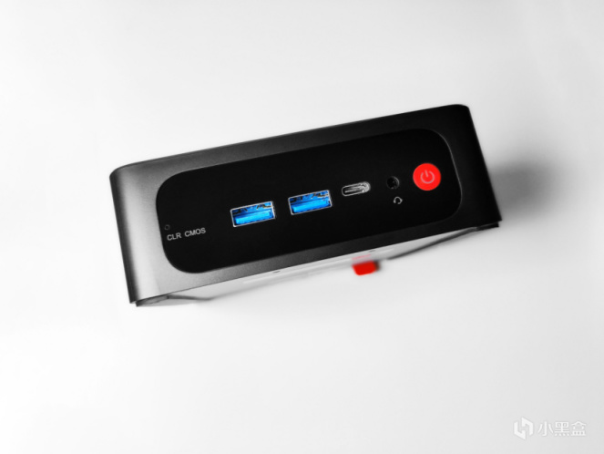正面分別是清除CMOS功能孔、兩個USB Type-A 3.2 Gen2 10Gbps接口、一個USB Type-C 10Gbps、3.5mm耳機麥克風二合一接口、紅色白光電源鍵。