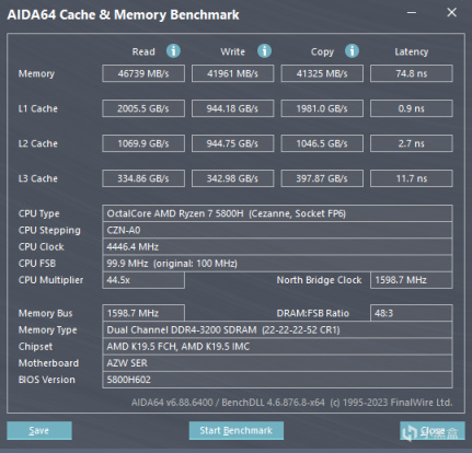 16GB DDR4 3200Mhz的雙通道內存測試,讀取速度46.7 GB/s,寫入速度41.9 GB/s,複製速度41.3 GB/s,延遲74.8 ns。