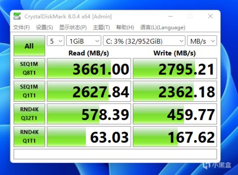 硬盤速度測試,讀寫分別達3661.00 MB/s、2795.21 MB/s。